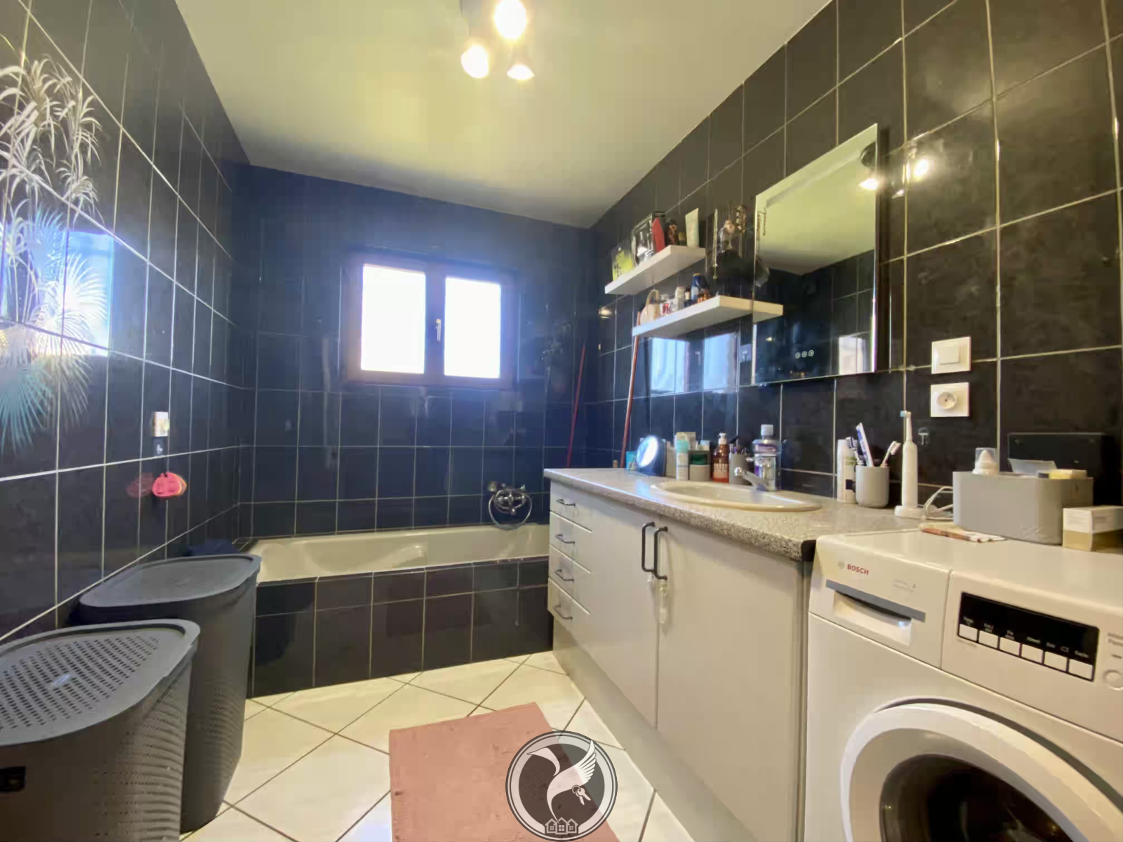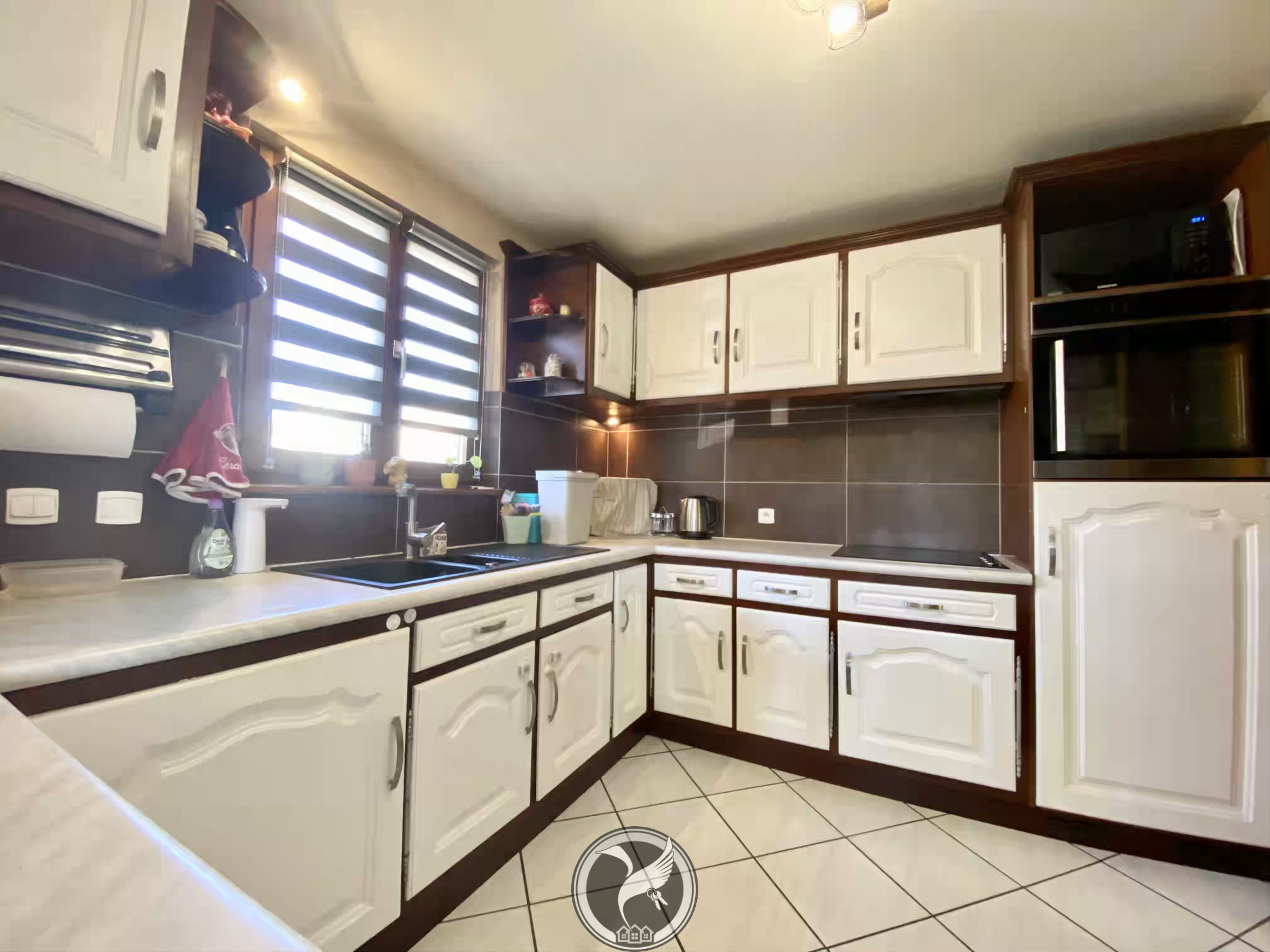 Au rez-de-chaussée, vous découvrirez une entrée avec placard desservant un séjour lumineux ouvert sur une cuisine aménagée et équipée. Une salle de bains complète, comprenant baignoire, douche, meuble vasque et sèche-serviettes, ainsi qu’un WC indépendant avec lave-mains complètent ce niveau.
