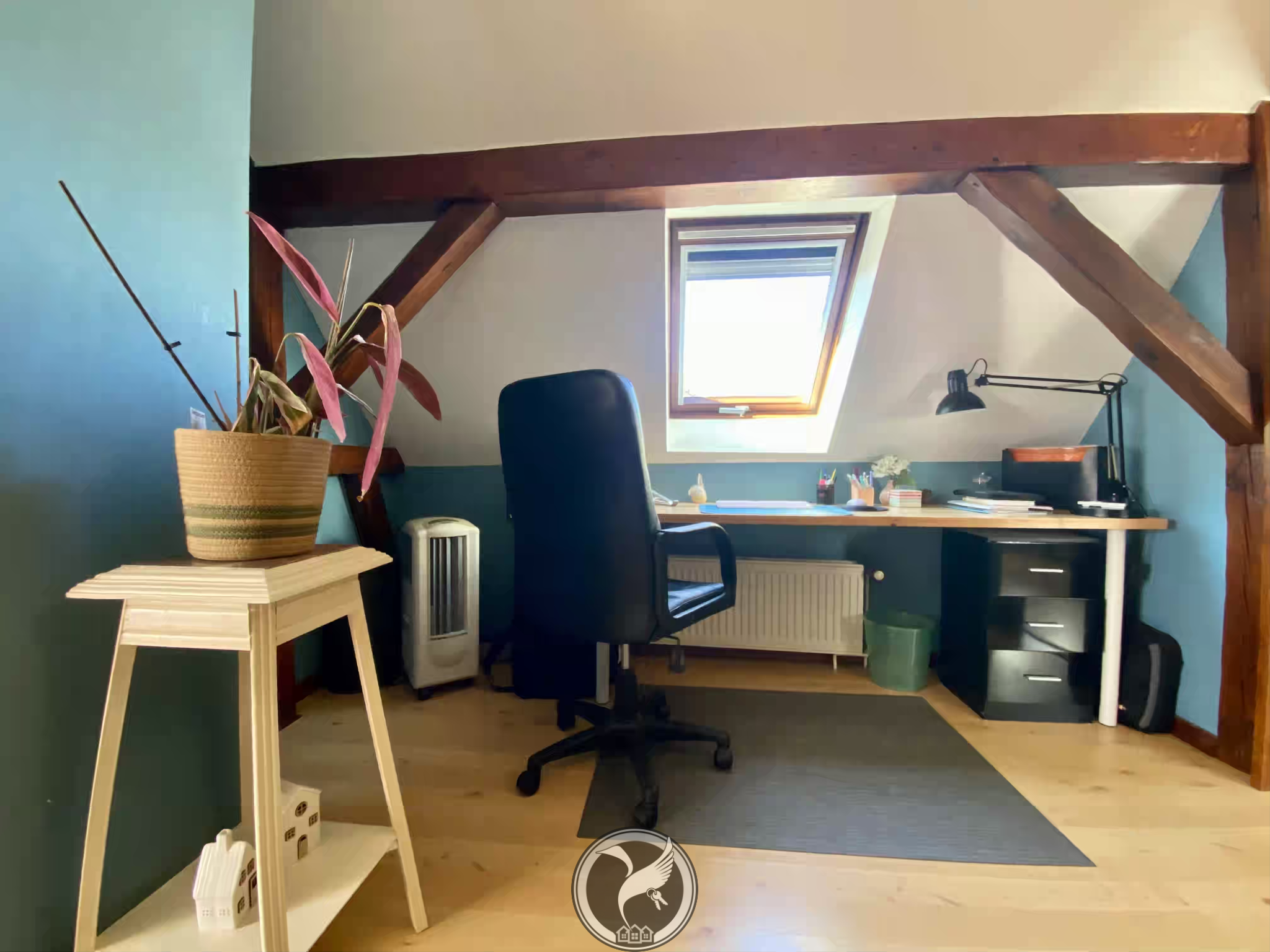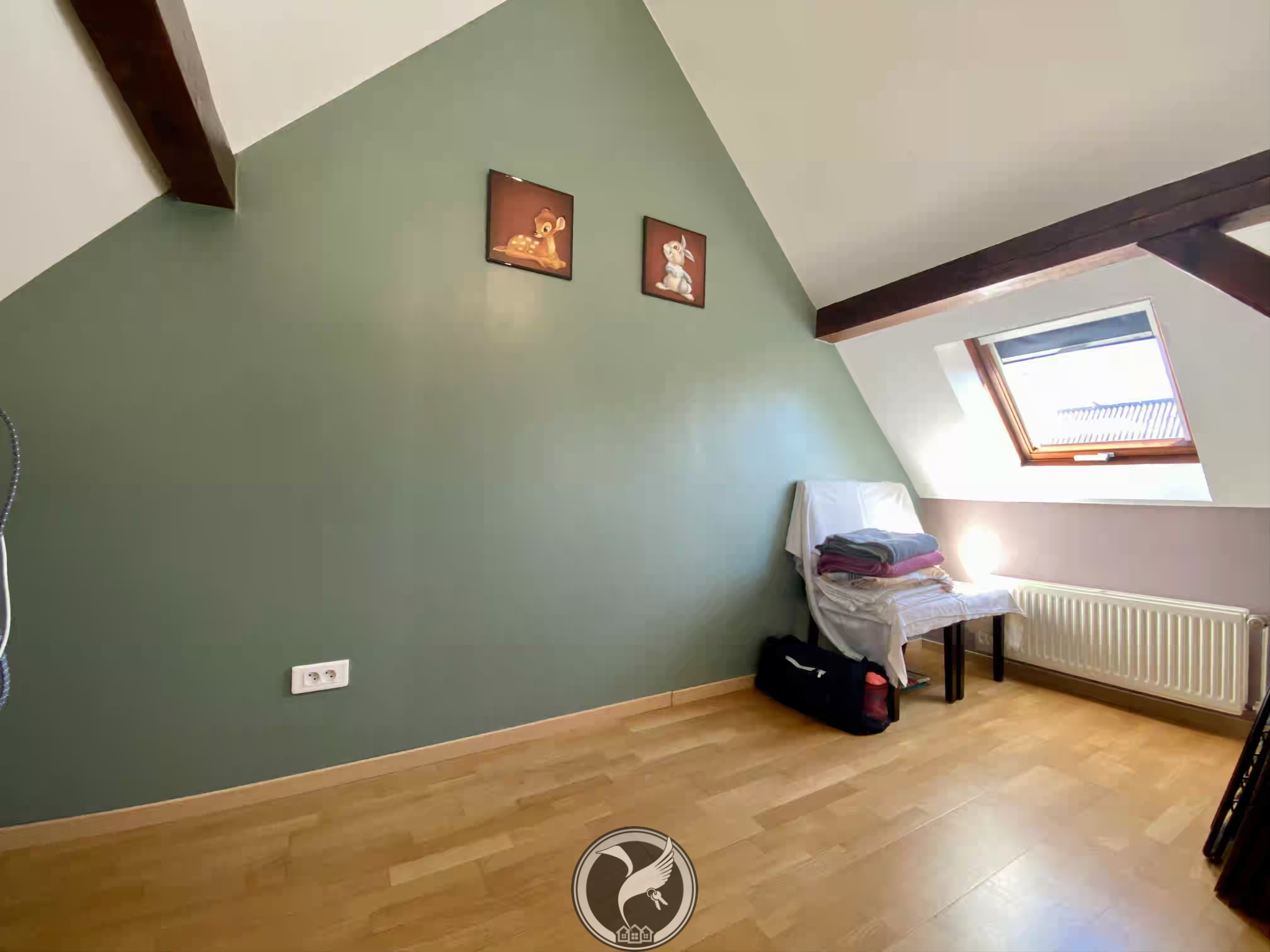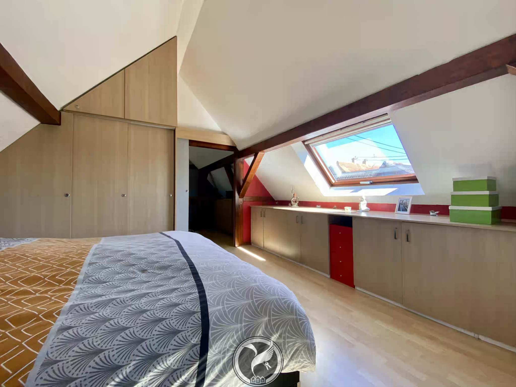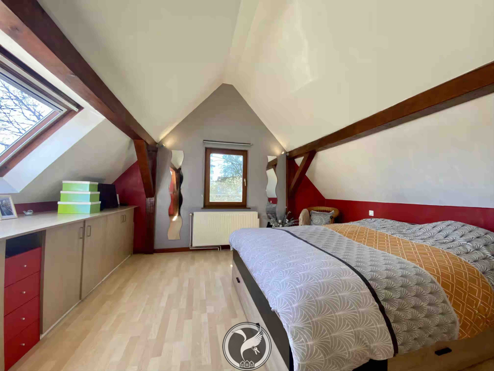 À l’étage, l’espace nuit se compose de deux chambres, dont une avec placards intégrés, ainsi qu’une mezzanine pouvant être aménagée en bureau ou espace détente.